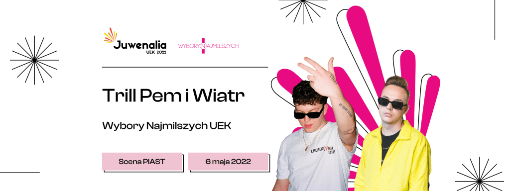 Po prawie dwuletniej przerwie Uniwersytet Ekonomiczny w Krakowie wraca z długo oczekiwanymi Juwenaliami UEK. To szereg wydarzeń trwających od 4 do 13 maja, które wzbudzają ogromne emocje nie tylko wśród studentów! Jednym z nich są Wybory Najmilszej Studentki i Super Studenta UEK-u nazywane również „Wyborami Najmilszych”.  Już 6 maja w klubie „Scena Piast”, o godzinie 18:30, 5 studentek i 5 studentów, wybranych poprzez wcześniejsze głosowanie, zmierzy się w kreatywnych i pełnych humoru konkurencjach, które pozwolą wyłonić zwycięzców! To jednak nie koniec atrakcji!  Jak co roku, na najmilszej scenie zaprezentują się znane gwiazdy muzyczne sceny rapu! W poprzednich latach na ,,Wyborach Najmilszych” zagościli m.in.: ReTo, Rasmentalism, czy Dwa Sławy. W tym roku na naszym show wystąpią Trill Pem oraz Wiatr!