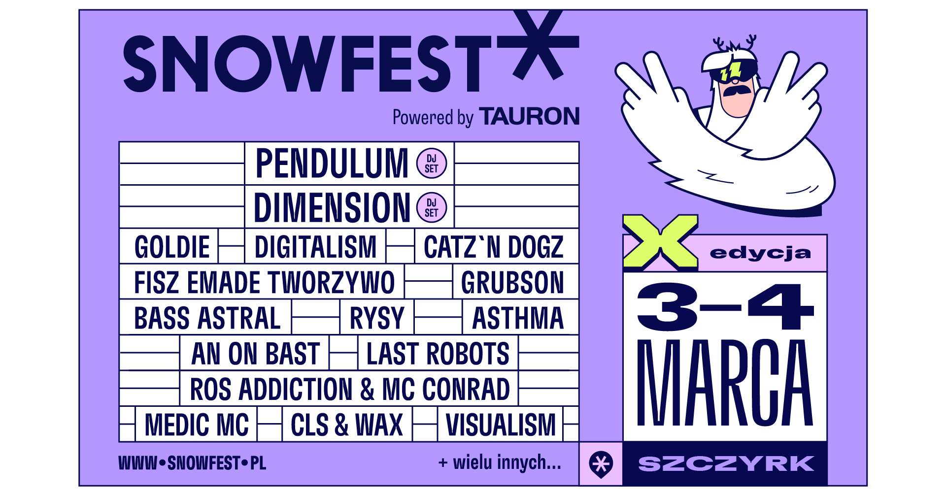 Na festiwalu pojawi się także wcześniej ogłoszony i wzmiankowany m.in. legendarny Dimension, uwielbiani w kraju nad Wisłą – Fisz Emade Tworzywo, zaskakujący Bass Astral, wszechstronna An On Bast oraz liryczny mistrz asthma. Nie zabraknie również szefa Metalheadz i uosobienia muzyki bassowej – Goldiego, który wystąpi z jednym z najprężniej rozwijających się autorów tekstów na bristolskiej scenie muzycznej – Medic MC, wielbiony przez SnowFestową publiczność pół-człowiek, pół-raper – Grubson, unikatowy projekt Rysy oraz powracających po latach do występowania na festiwalowych scenach – Pendulum.