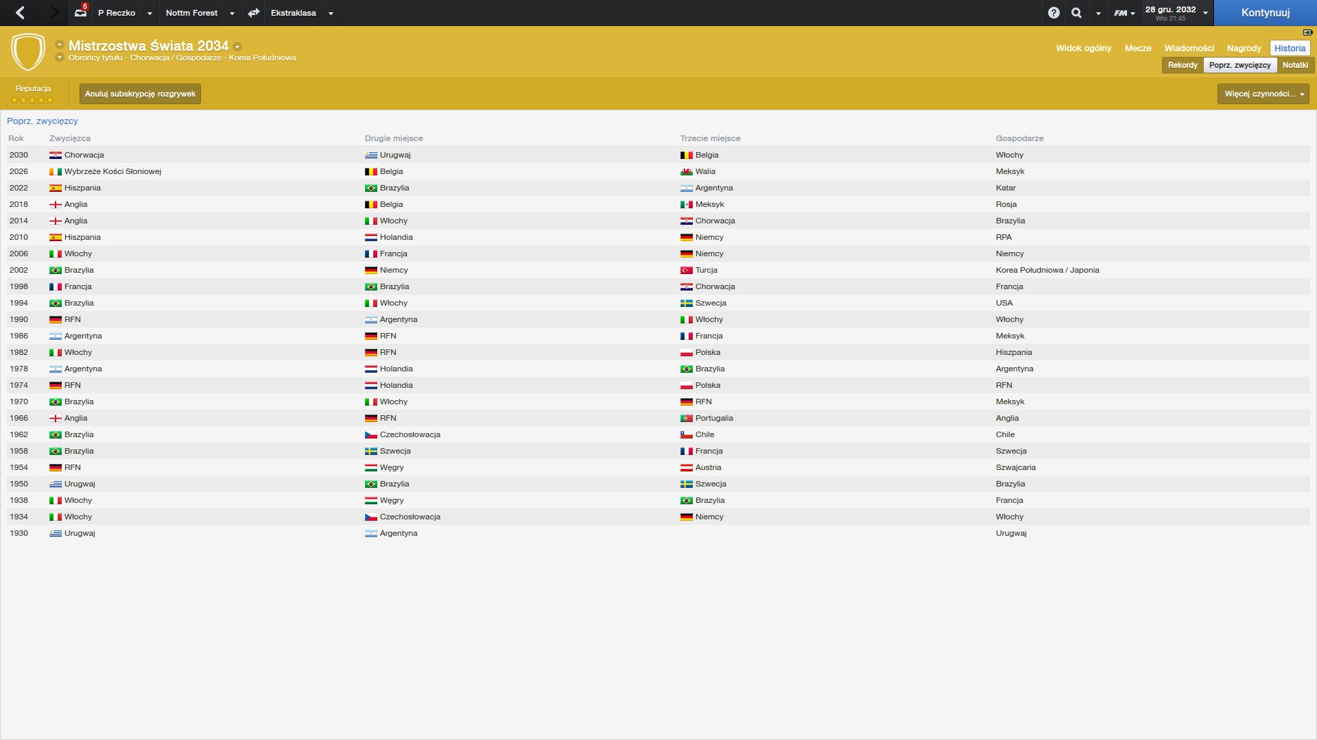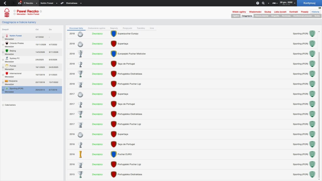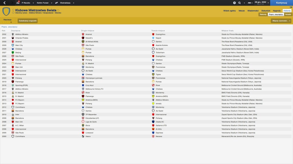 Po zmianie właściciela w klubie pojawiło się więcej grosza, przez co mogłem robić normalne transfery i nie opierać drużyny na testowanych piłkarzach. W ten sposób ściągnąłem paru afrykańskich talentów, którym nie powiodło się w Europie i swojego super napadziora z Bejing – Yu Yuana o którego swego czasu pytał się Arsenal Londyn. W ostatecznym rozrachunku udało się wygrać ligę trzy razy z rzędu (W ostatnim sezonie na 30 meczy ligowych, wygrałem 28). Dodatkowo wygrałem tutaj mnóstwo innych pucharów takich jak Be The Coach, Puchar Ośmiu, Afrykański Puchar Konfederacji, Puchar Ligi, Puchar Republik Południowej Afryki, Superpuchar Afryki oraz Ligę Mistrzów Afryki i Klubowe MŚ. Po tych wszystkich sukcesach mogłem w końcu wrócić do Europy. W między czasie miałem mnóstwo ofert z Anglii i Włoch, wszystkie jednak odrzucałem. Liczyłem trochę na możliwość prowadzenia drużyny West Ham United, niestety po spadku nie wrócili już do Premier League na sezon 2032/33. Dostałem oferty z Newcastle i Nottingham Forrest, wybrałem tych drugich. Póki co walczę by nie zostać wyrzuconym i ponownie zaistnieć w Europie. Co będzie dalej? Jeszcze nie wiem…