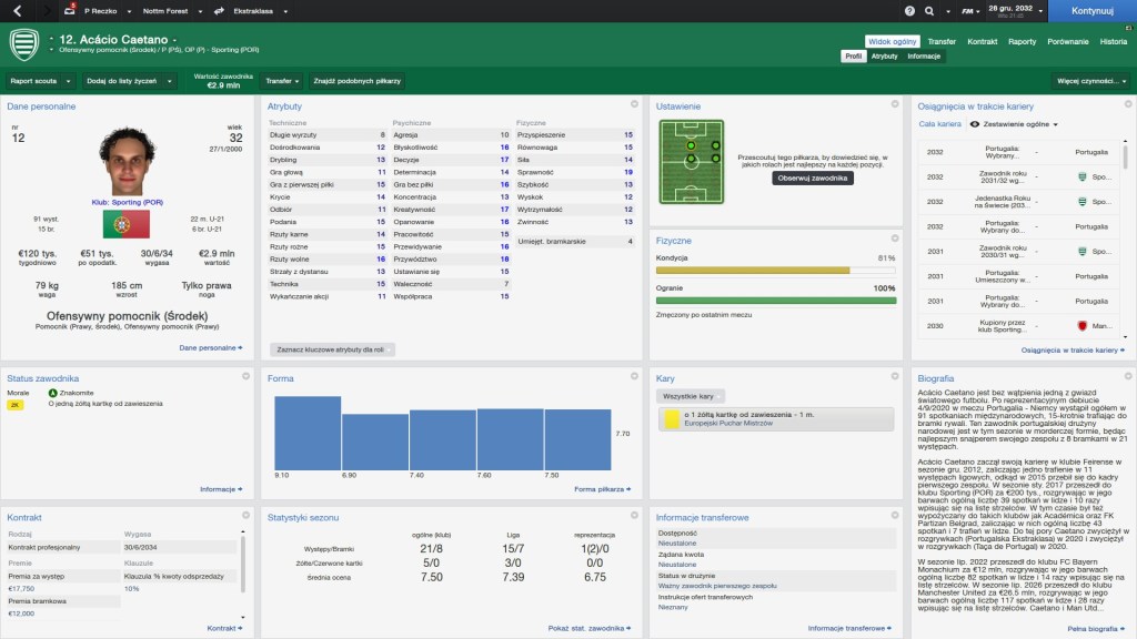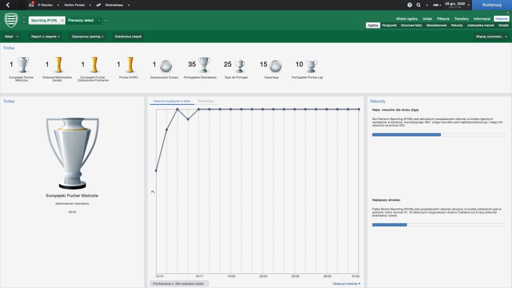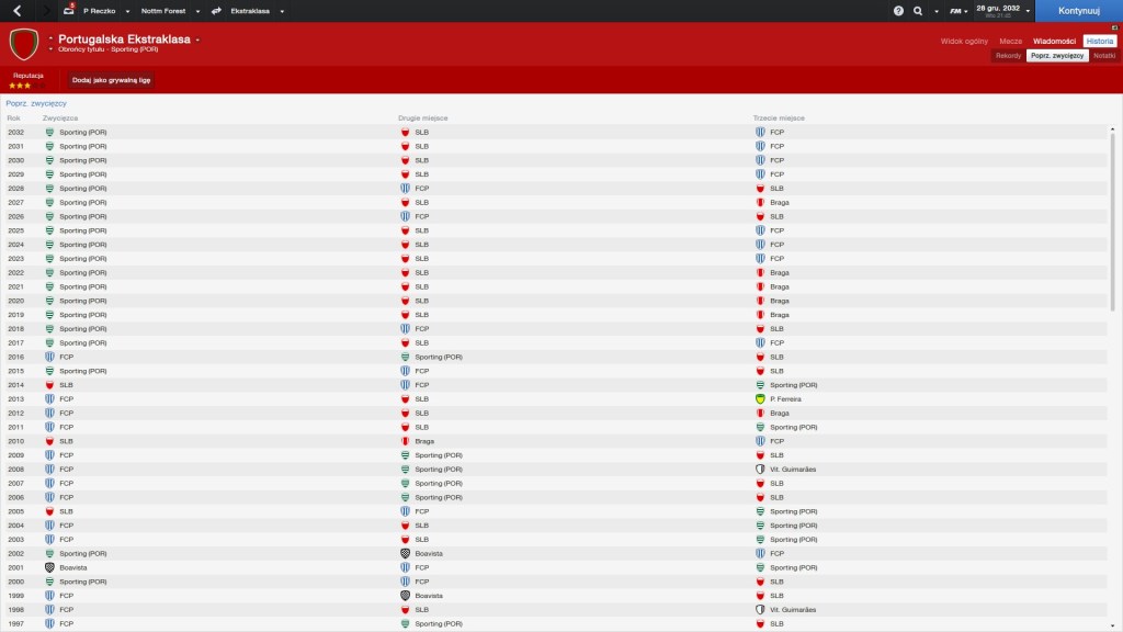 Już dawno zdałem sobie sprawę, że granie dobrymi klubami nie przynosi zbyt wiele radość. Dlatego też Milan w FMie ostatni raz prowadziłem w czasach szkolnych. Jako, że ligę włoską i polską mam już ograną na maksa, a swoje boje toczyłem także w Rosji, Anglii, Francji, Niemczech, Hiszpanii czy też USA to postanowiłem sprawdzić kolejne miejsce na piłkarskiej mapie. Padło na Portugalię, ale w sumie teraz się dziwię temu wyborowi, gdyż średnio przepadam za tymi kierunkami. Klub? Zawsze wybieram totalnych nowicjuszy albo kluby z bogatą historią, których blask przygasł. Te drugie znacznie częściej. I tym tropem podążałem wybierając Sporting Lizbona. Klub dość mocny – OK, ale w lidze Portugalskiej dominuje FC Porto i Benefica Lizbona. Dlatego też cel okazał się ciekawy – przerwać ich dominację. Pierwszy sezon zawsze jest najgorszy. Nie wiele można zmienić. Skład już jest ustalony, sztab trenerski obsadzony a ewentualne wzmocnienia poczynię dopiero za rok lub dwa lata. To dobry jednak moment by ograć taktykę, zoptymalizować treningi, skupić się na poszerzeniu scoutingu i poznać ligę.