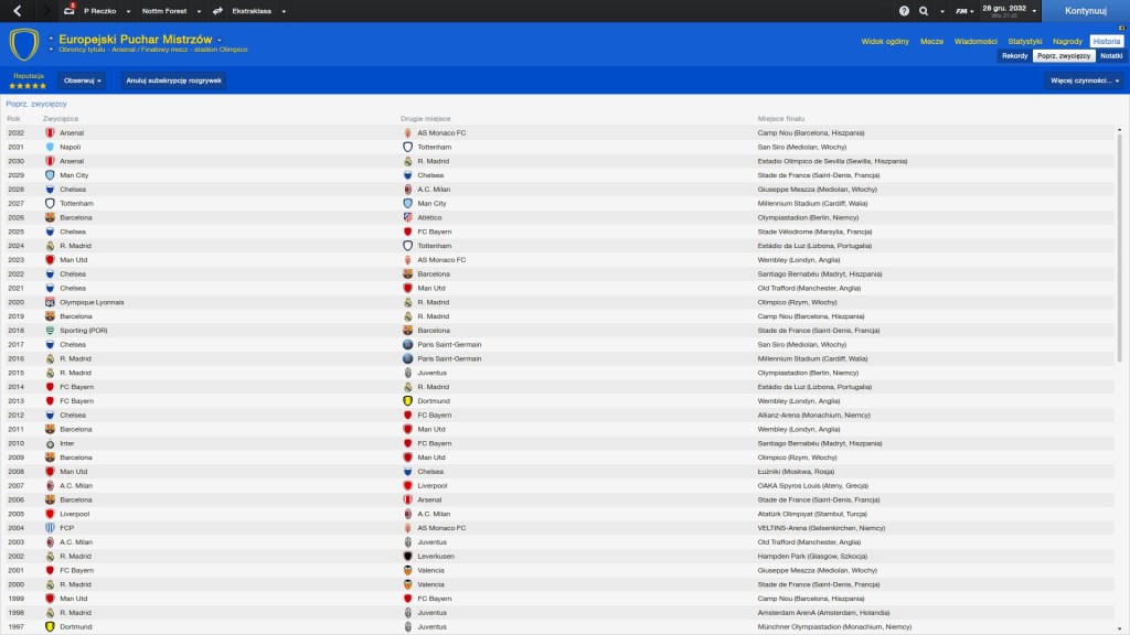 Niestety poczynione wzmocnienia wciąż okazały się za słabe na LM. Ponownie nie uporałem się z fazą grupową i zakończyłem te rozgrywki na 3 miejscu w grupie F, gdzie znajdowali się także AC Milan, Real Madryt i Dinamo Zagrzeb. Nie przeszkodziło mi to jednak na osiągnięcia sukcesu w Lidze Europy, gdzie po kolei eliminowałem: Atletico Madryt, AS Saint-Etienne, Olympique Lyon i Zenit Sankt-Petersburg. Natomiast w finale pewnie pokonałem CSKA Moskwa 2:0. Sukces na arenie międzynarodowej przypłaciłem zajęciem drugiego miejsca w lidze, gdzie nie było mocnych na drużynę FC Porto. Jednak kolejne transfery (Daniele Rugani z Juve za free i newgen Rodrigo Gomez) pomogły mi wrócić na ligowy tron. Co więcej udało się w końcu wydostać z fazy grupowej LM, co prawda nie na długo – bo już w pierwszej rundzie ponownie przeszkadza mi AC Milan z Clarencem Seedorfem na ławce (Swoją drogą koleś staje się jednym z najlepszych menadżerów w grze i w 2034 roku wciąż jest trenerem Milanu…)