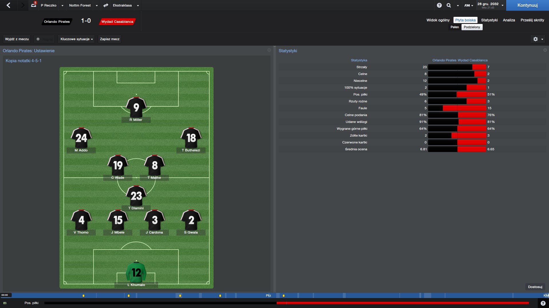 Przyznam, że już grając w Australii zatęskniłem za powagę europejskich rozgrywek. Jednak skoro objechałem już połowę świata, to szkoda byłoby to tracić. Był jednak jeden moment zawahania, gdy zwolnił się etat w Arsenalu po Jurgenie Kloppie. Niestety Kanonierzy wyśmiali moją ofertę toteż postanowiłem dokończyć misję i pojawiłem się w Orlando Pirates. Liga RPA to taka trochę polska ekstraklasa, czyli głupie błędy, szalone wyniki i zero przestrzegania taktyki. Wiele razy przegrywałem mecz 4:3 po prowadzeniu już 3:0. Tutaj wszystko się mogło wydarzyć. Nie wspominając częstych wyników typu 9:0 czy 8:1. To tutaj jest na początku dziennym. W pierwszym sezonie nie szło mi dobrze, media już spekulowały o moim zwolnieniu. Udało mi się jednak ogarnąć i wskoczyć na trzecie miejsce. Braki kadrowe uzupełniałem piłkarzami na testach, którzy mogli brać udział w oficjalnych meczach. Co więcej nie wchodzili w limit obcokrajowców, dlatego siłę mojej drużyny budowałem do pewnego momentu na tego typu grajkach. Było to dość niebezpieczne bo w każdym momencie mogli opuścić klub… nie raz się zdarzyło, że brakowało mi piłkarzy na ważny mecz…