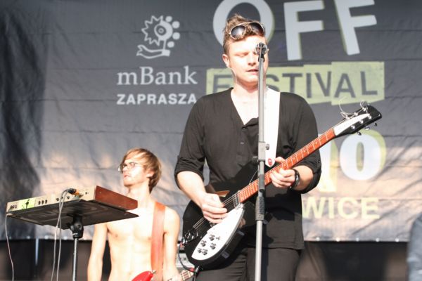 Off rozpoczął się już w czwartek, jednak nie posiadałem karnetu czterodniowego by zobaczyć klubowy występ ludzików z Matmos. Dla mnie festiwal zaczął się w piątek od występu Cieślaka z księżniczkami. Maciej Cieślak jest już żyjącą legendą polskiej muzyki offowej. Lider Ścianki, członek Lenny Valentino, poza tym takie muzyczne projekty jak Kings of Carmel, Wyjebani w Dobrej Wierze i teraz Cieśłak i Księżniczki. Muszę przyznać, że początek brzmiał bardzo uroczo. Trzy panie wspomagające Cieślaka grały lekko i nie nudziły a sam boss, który na Offie zbierał pokłony był w dobrej formie wokalnej. Troszkę przeszkadzał upał w namiocie i jęki Waglewskich w tle, które zagłuszały ekipę Cieślaka. Warto odnotować, że podczas tego koncertu miała premiera debiutanckiej płyty, której piosenki mieliśmy okazję usłyszeć na żywo. Następny występ to jedyna okazja by zobaczyć po raz pierwszy w Polsce człowieka o którym mówi się w kategorii zbawcy alternatywy. o 17:50 swoje 5 minut miał Toro y Moi. Chaz Bundick, który w ponad 40 minutowym gigu zmieścił najlepsze kawałki z Causers of This zachwycił Katowicką publikę. Przy akompaniamencie perkusji i basu brzmiał bardzo fajnie i tanecznie. Troszkę wokal gdzieś funkcjonował za muzyką, ale jak na debiutanta, który nagrywa niemal dziesiątkowe płyty było bardzo wesoło. Ludziom się podobało. W końcu pierwszy koncert na powietrzu pod gołym niebem. Na Scenie głównej mBank grał angielski zespół The Horrors. Wiązałem duże nadzieje z ich występem, gdyż spodobali mi się na płycie Primary Colours. I co by tu powiedzieć? Zawiedli troszkę. Początek mieli bardzo obiecujący, Mirror’s Image czy też Who Can Say zabrzmiało tak jakbym tego chciał, ale im dalej koncert trwał tym było nudniej. Kolesie straszyli jak na horrorsów wypada swoimi mega fujfuj obcisłymi gaciami a gitarzystwa wymachiwał nóżką jak nastoletnia fanka Green Day. Muszą się wiele jeszcze nauczyć.